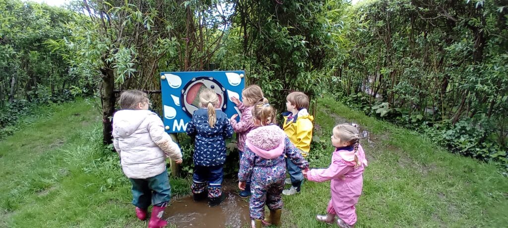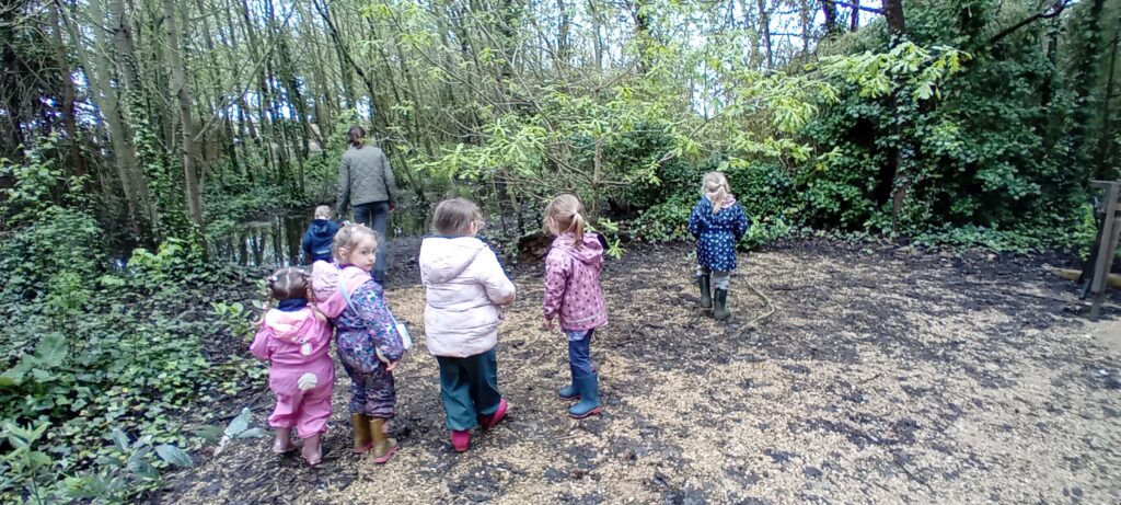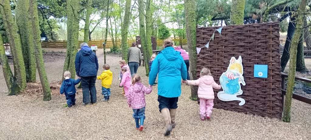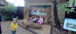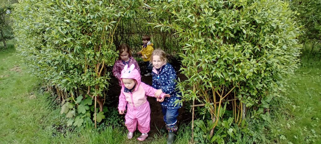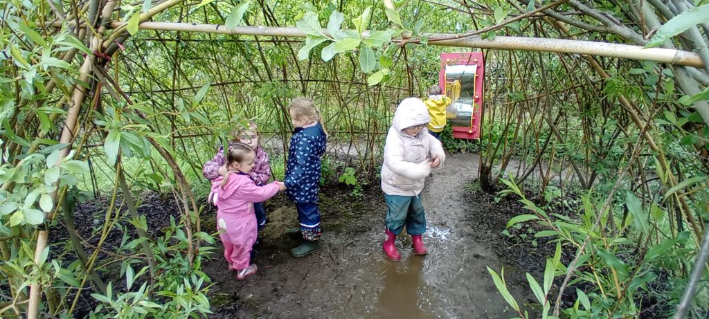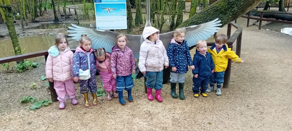 Meeting at the Swannery this week the children came prepared for the wet weather. Wellies were definitely needed, however we were lucky not to get any rain. After listening to ‘The Ugly Duckling’ story in the outdoor classroom Abbotsbury Swannery kindly offered us we headed out to follow the Bramley Hedge Trail. Later, the children built a nest for their eggs and carefully decorated them. After lunch the children went on a nature hunt and got lost in the maze. We ended up at the play area for our final stop of the day.