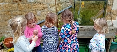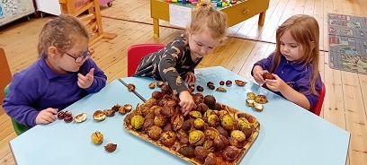 Discovering conkers this week, the children carefully opened the partly wrapped in their spiky green cases, conkers. Revealing the mahogany nuts the children described their small, big, smooth finds, and were delighted to sometimes find more than one in the husks.