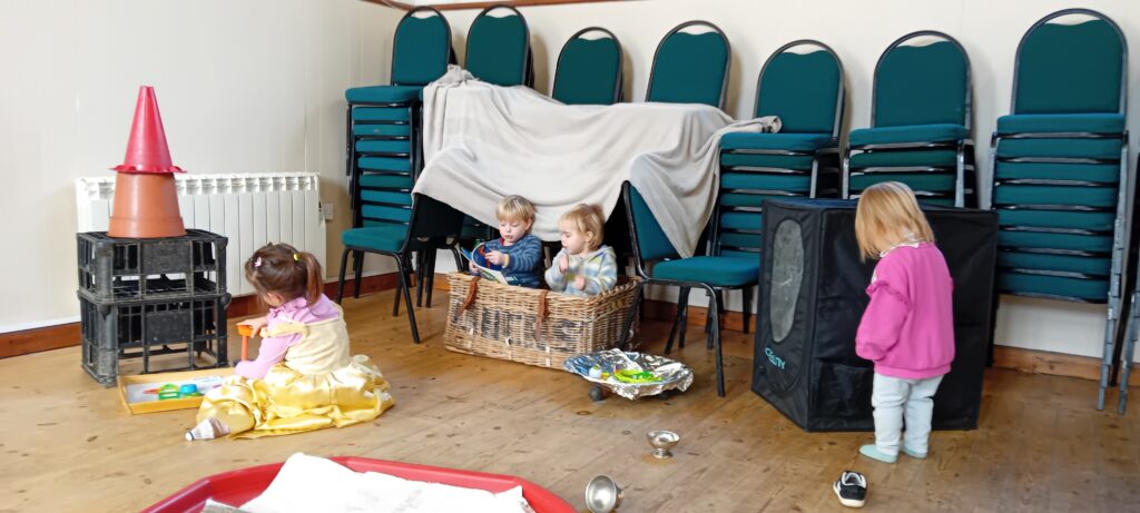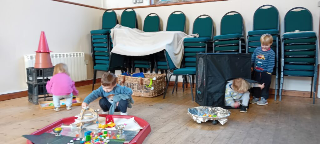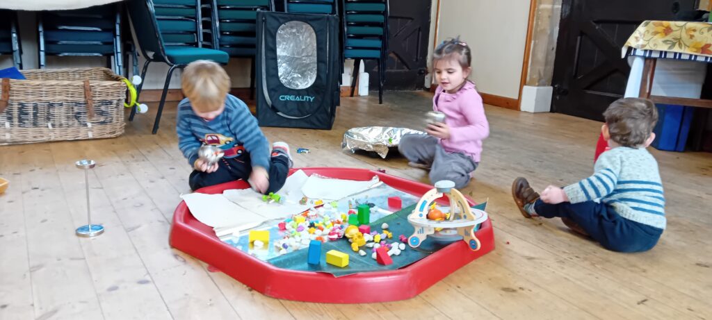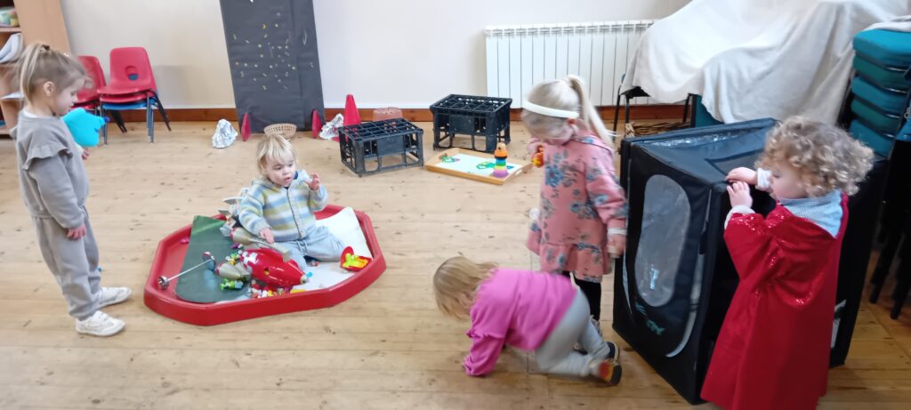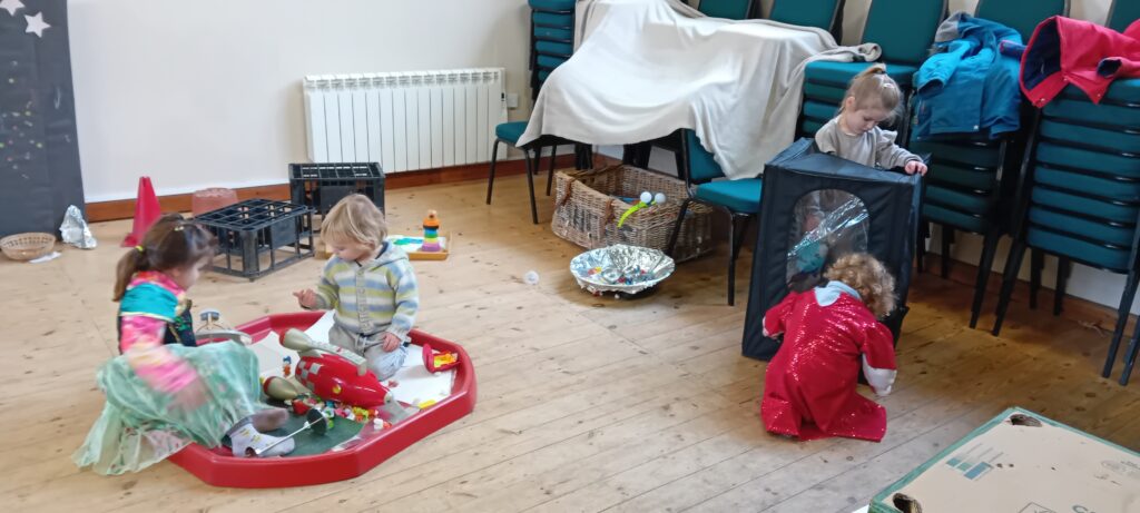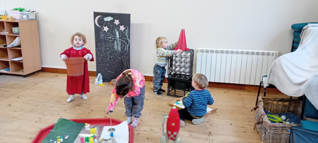 Claire created a magical space scene in the play room this week. The small world space play took the children far beyond the village—right into outer space! They children worked together to build a rocket using stackers and magnetic tiles, crates and cones. They decorated the night sky with planet stickers and drawings, explored ‘moon dust’, and read space related books.