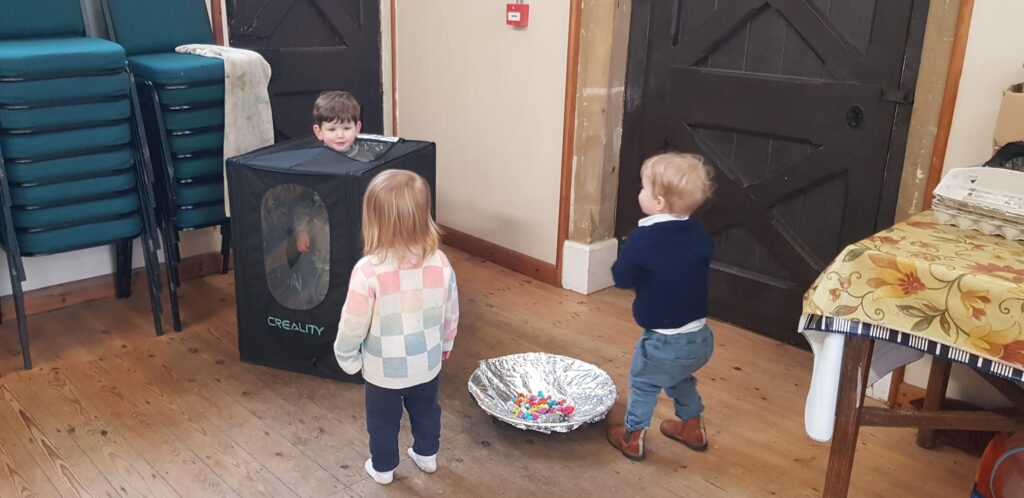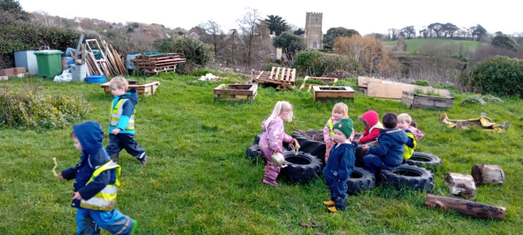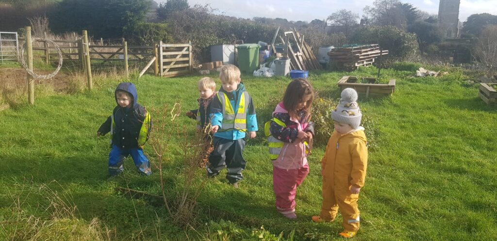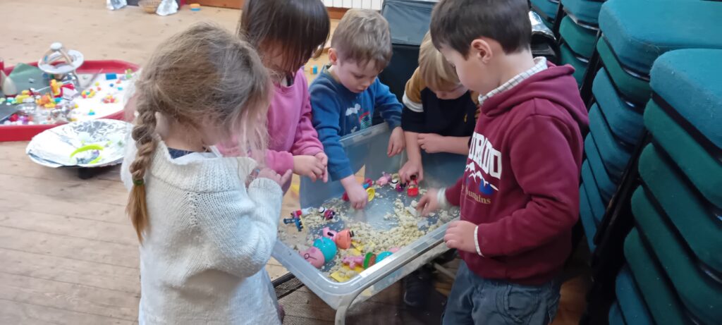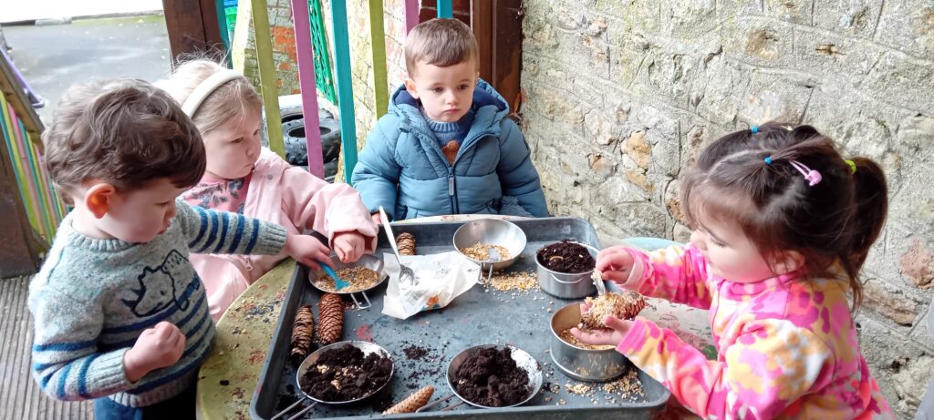Continuing the children’s interest in birds the children enjoyed feeding birds using pipe cleaners, developing their fine motor skills as they threaded and twisted, and made pine cone bird feeders. At the allotments, imaginations ran wild as we pretended to feed baby birds, by hunting for “worms”.