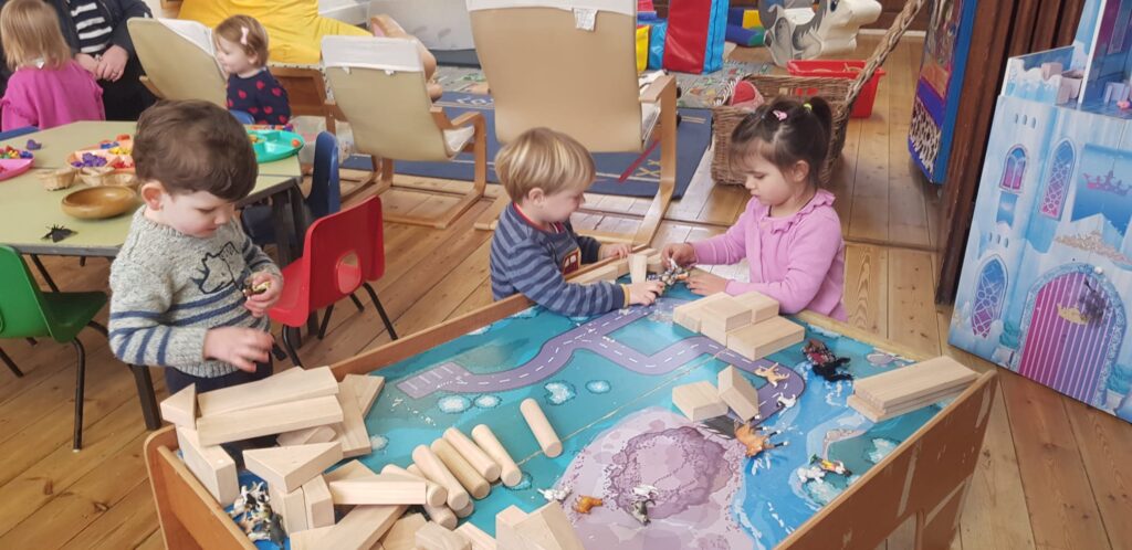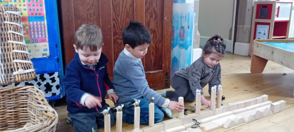 Using wooden arches and bricks to build balanced structures children carefully placed toy cats on top, adjusting the blocks when the cats fell and trying again. The children showed concentration, problem-solving, and fine motor control, and shared ideas about how to make the structures stronger.